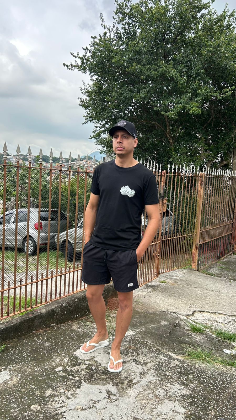 Camiseta com estilo mais espojado na frente uma estampa básica, na costa um desenho com a cara da camiseta.